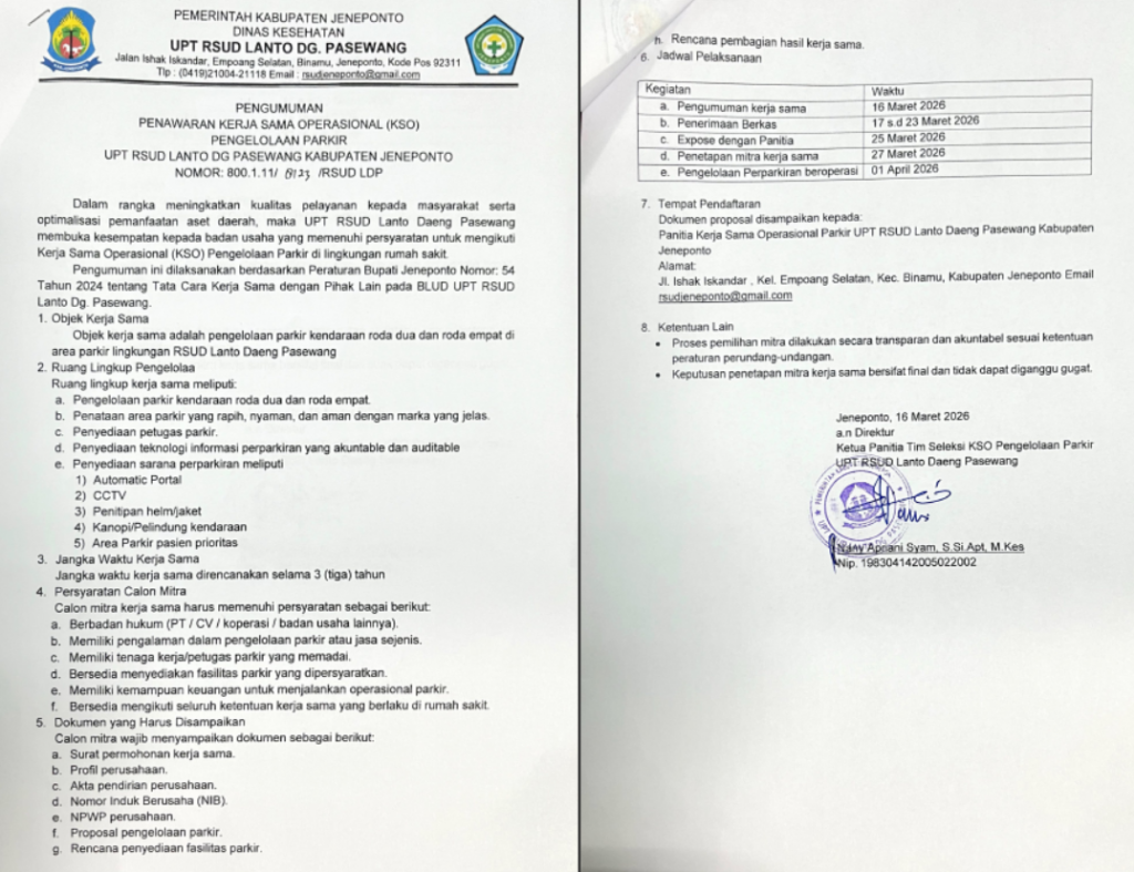 Pengumuman Penawaran Kerja Sama Operasional (KSO) Pengelolaan Parkir UPT RSUD Lanto Dg Pasewang March 16, 2026 Andi Agustiawati